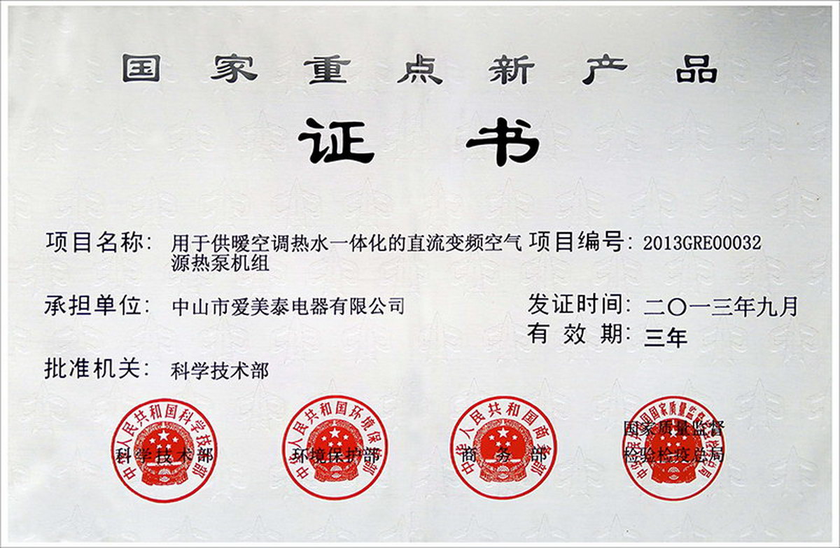 熱立方先后榮獲“國家高新技術企業”、“國家知識產權優勢單位”、“國家重點新產品”、“廣東省科技成果技術獎”、“廣東省高新技術產品”、“廣東省科技進步一等獎”、“廣東省高效智能熱泵工程技術研究中心”、“中山市科學技術進步獎”、“煤改清潔能源突出貢獻單位”等榮譽稱號,同時產品還獲得歐洲節能熱泵委員會頒發的Q-Label認證、歐洲最高節能認證A+++。